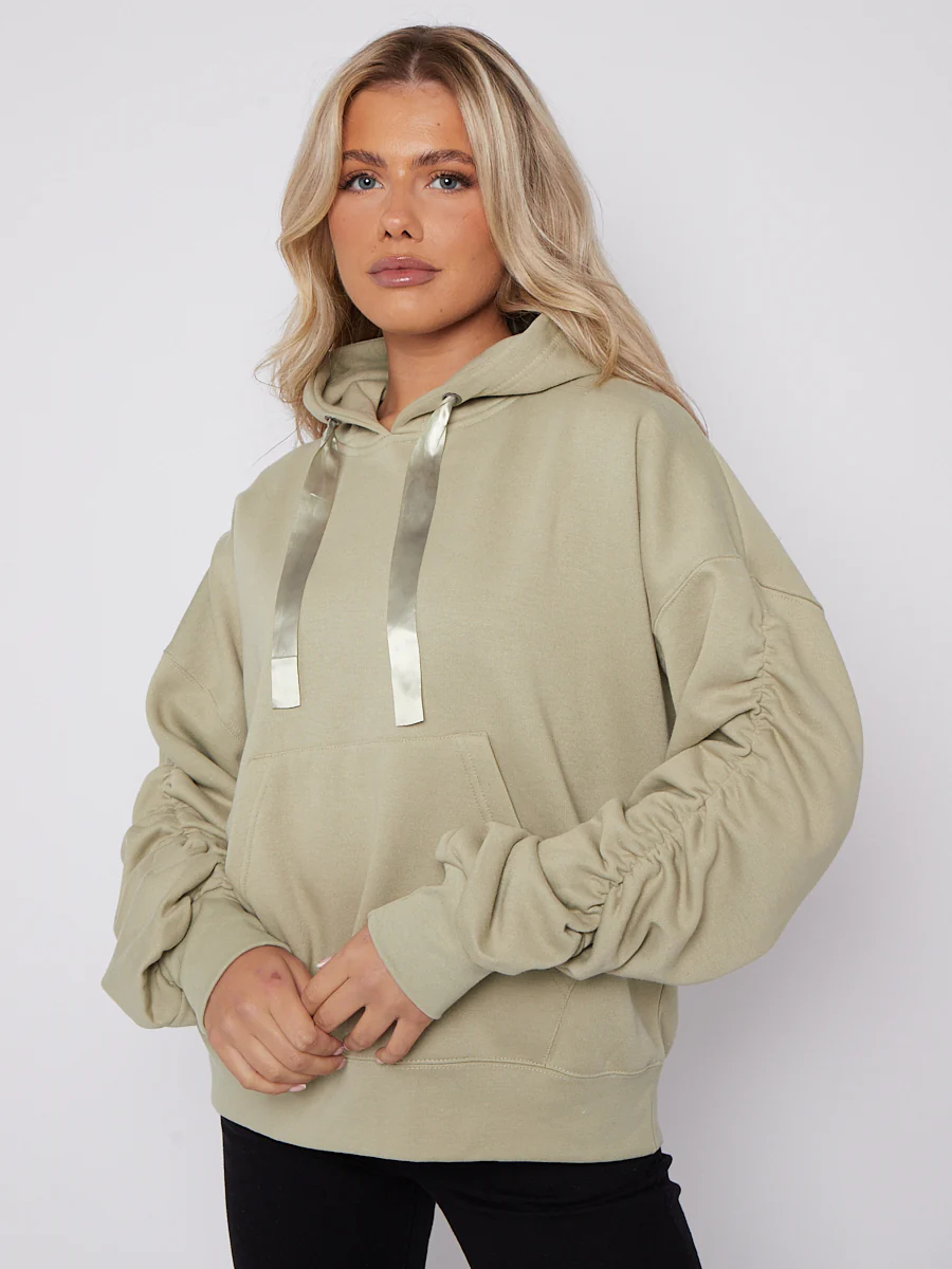 Ribbon Drawstring Ruched Sleeves Fleeced Hoodie
